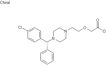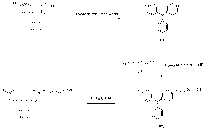 The resolution of racemic 1-[(4-chlorophenyl)phenylmethyl]piperazine (I) with L-tartaric acid provided the required (R)-enantiomer (II), which was condensed with (2-chloroethoxy)acetonitrile (III) in the presence of Na2CO3 and KI in refluxing n-butanol to give the alkylated piperazine (IV). The nitrile group of (IV) was finally hydrolyzed by means of concentrated hydrochloric acid to yield the target carboxylic acid.