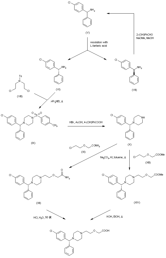 In a further procedure, racemic (4-chlorophenyl)phenylmethyl amine (V) was resolved by means of L-tartaric acid. The undesired (S)-enantiomer (VII) could be recovered by racemization to (V) upon treatment with 2-hydroxybenzaldehyde and NaOMe. The required (R)-enantiomer (VI) was condensed with N,N-bis(chloroethyl)-p-toluenesulfonamide (VIII) in refluxing diisopropylethylamine to provide the N-tosyl piperazine (IX). Deprotection of the p-toluenesulfonamide of (IX) was achieved by treatment with HBr in the presence of 4-hydroxybenzoic acid. The resulting piperazine (X) was alkylated with either (2-chloroethoxy)acetamide (XI) or methyl (2-chloroethoxy)acetate (XIII), affording the N-alkylated piperazines (XII) and (XIV), respectively. The title carboxylic acid was then obtained by hydrolysis of amide (XII) with aqueous HCl or, alternatively, by hydrolysis of ester (XIV) with ethanolic KOH.