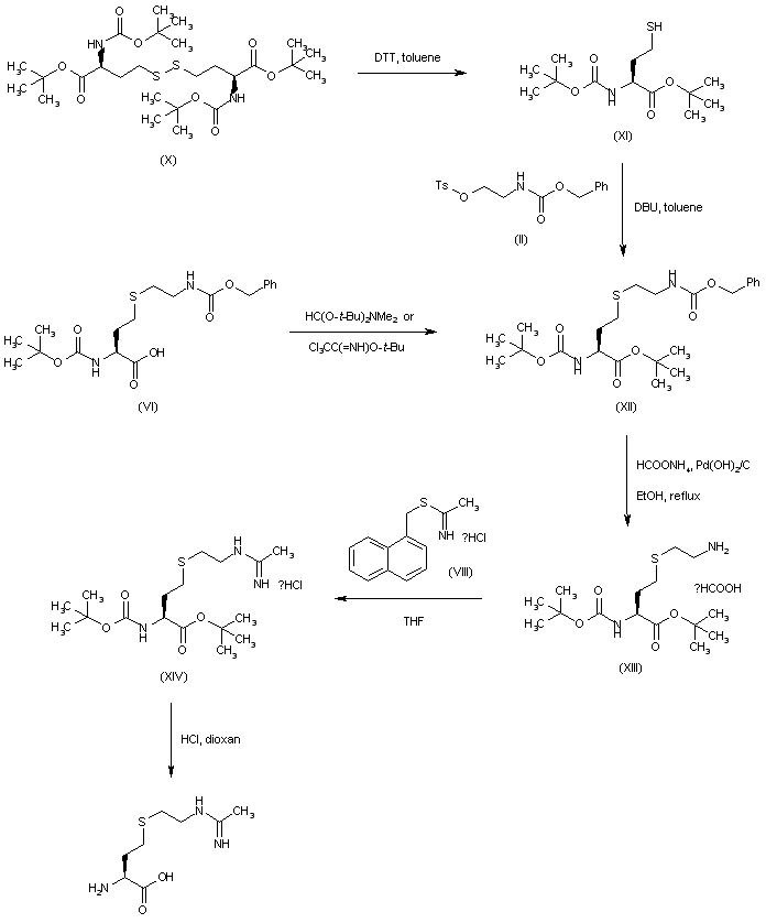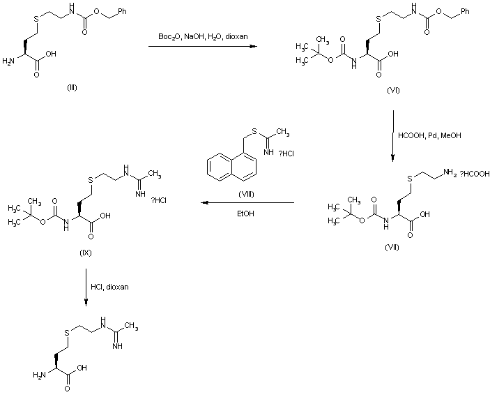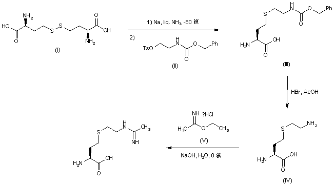 Reductive cleavage of L-homocystine (I) with sodium in liquid ammonia produced homocysteine, which was subsequently alkylated with 2-(N-benzyloxycarbonyl-amino)ethyl tosylate (II) to afford thioether (III). The benzyloxycarbonyl protecting group of (III) was cleaved with HBr to give diamine (IV). Finally, condensation with ethyl acetimidate (V) furnished the target amidine.