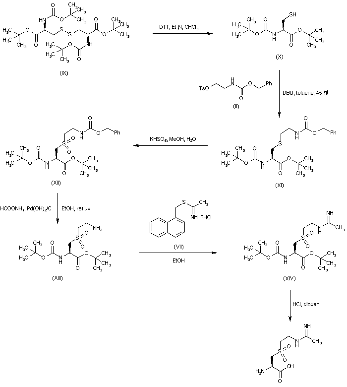 In a related procedure, N-Boc-L-cysteine tert-butyl ester (X) was prepared by reduction of N-Boc-cystine tert-butyl ester (IX) with dithiothreitol (DTT). Alkylation of thiol (X) with tosylate (II) afforded thioether (XI). After oxidation of (XI) to sulfone (XII), transfer hydrogenolysis using ammonium formate and palladium hydroxide on carbon removed the benzyloxycarbonyl group to furnish amine (XIII). This was converted to amidine (XIV) by treatment with thioacetimidate (VII). Finally, deprotection of the Boc group and the tert-butyl ester of (XIV) by means of HCl in dioxan afforded the title compound.