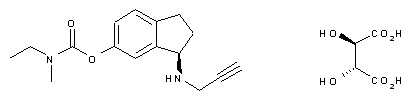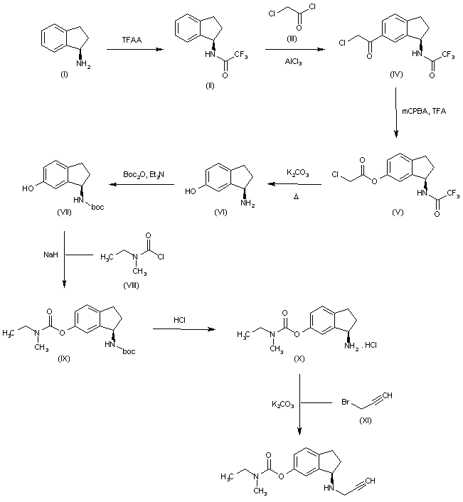 Treatment of (R)-1-aminoindan (I) with trifluoroacetic anhydride in toluene affords trifluoroacetyl derivative (II), which is condensed with chloroacetyl chloride (III) by means of AlCl3 in 1,2-dichloroethane to provide compound (IV). Oxidation of chloroacetyl derivative (IV) with 3-chloroperoxybenzoic acid (mCPBA) and TFA in CH2Cl2 allows formation of chloroacetoxy (V), which is converted into the hydroxy form (VI) by heating in hot methanol/H2O in the presence of K2CO3. N-Protection of (VI) is then performed by treatment with di-t-butyl dicarbonate and Et3N in THF to furnish Boc derivative (VII), which is then converted into derivative (IX) by O-acylation with N-Me, N-Et carbamoyl chloride (VIII) by means of NaH in acetonitrile. Removal of the Boc group of (IX) by treatment with HCl (gas) in dioxane gives hydrochloride (X), which is finally N-alkylated with propargyl bromide (XI) by means of K2CO3 in acetonitrile to yield the desired product.