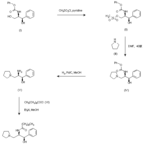 | 合成路线图解说明: (1R,2R)-2-Benzyloxycarbonylamino-1-phenyl-1,3-propanediol (I) was converted to mesylate (II) upon treatment with methanesulfonyl chloride in pyridine. Reaction of this mesylate with pyrrolidine (III) provided pyrrolidino compound (IV). The N-benzyloxycarbonyl group of (IV) was then eliminated by hydrogenolysis over Pd/C to yield the vicinal hydroxyamine (V), which was finally condensed with decanoyl chloride (VI) to furnish the target decanoyl amide. |