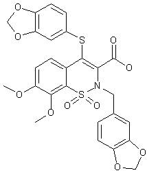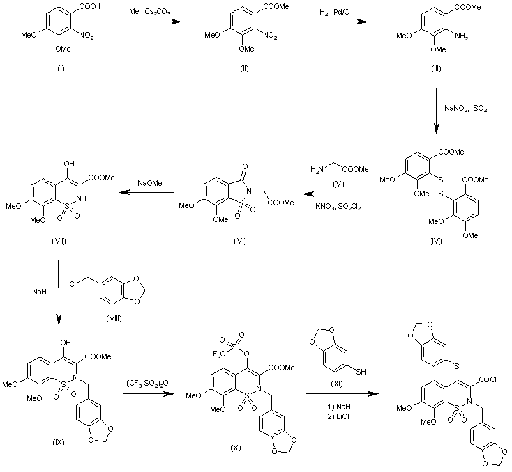The esterification of 3,4-dimethoxy-2-nitrobenzoic acid (I) with methyl iodide and cesium carbonate gives the corresponding methyl ester (II), which is reduced with H2 over Pd/C yielding the expected 2-amino compound (III). The reaction of (III) with NaNO2 and SO2 affords the disulfide (IV), which is cyclized with methyl glycinate (V) by means of KNO3 and SO2Cl2 giving the benzoisothiazolone derivative (VI). The rearrangement of (VI) by means of sodium methoxide yields the 1,2-benzothiazine derivative (VII), which is condensed with 3,4-methylenedioxybenzyl chloride (VIII) by means of NaH in DMF affording the N-substituted benzothiazine (IX). The reaction of (IX) with triflic anhydride gives the triflate ester (X), which is condensed with 3,4-methylenedioxythiophenol (XI) by means of NaH in DMF and hydrolyzed with LiOH in THF to provide the target compound.