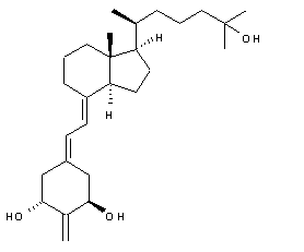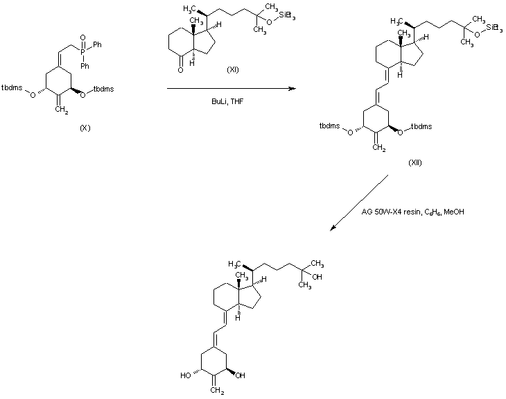 Wittig-Horner coupling of phosphine oxide (X) with the protected 25-hydroxy Grudmann's ketone (XI) produces the target 19-norvitamin D derivative (XII). Finally, complete desilylation of (XII) with a cation-exchange resin in MeOH/benzene leads to the title compound.