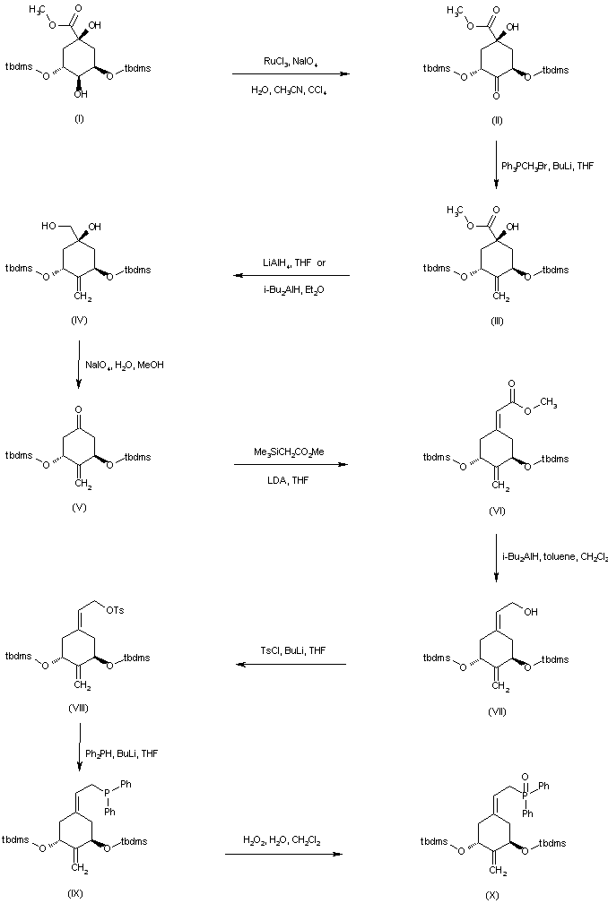 The disilylated methyl quinicate (I) is oxidized to ketone (II) employing RuCl3 and NaIO4. Subsequent Wittig reaction of ketone (II) with methylenetriphenylphosphorane leads to olefin (III). Reduction of the ester function of (III) is performed by either treatment with DIBAL or, in an improved process, with LiAlH4. The resultant vicinal diol (IV) is then subjected to oxidative cleavage with NaIO4, producing ketone (V). Petrson olefination of (V) with methyl (trimethylsilyl)acetate affords the unsaturated ester (VI), which is further reduced with DIBAL to the allylic alcohol (VII). Tosylation of alcohol (VII), followed by displacement of tosylate (VIII) with the lithium salt of diphenylphosphine generates the allylic phosphine (IX). This is then oxidized by H2O2 to the phosphine oxide (X).
