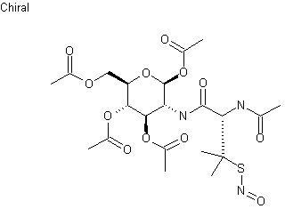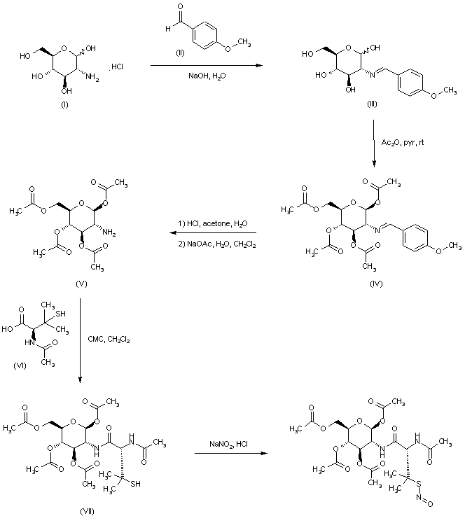 | 合成路线图解说明: Condensation of glucosamine (I) with anisaldehyde (II) gave imine (III). Subsequent acetylation of (III) with Ac2O in pyridine produced the tetra O-acetate (IV). The imine group of (IV) was then hydrolyzed with HCl in aqueous acetone to afford, after basic work-up, glucosamine tetraacetate (V), which was coupled with N-acetyl penicillamine using 1-cyclohexyl-3-(2-morpholinoethyl)carbodiimide metho-p-toluenesulfonate to yield amide (VII). Finally, nitrosation of the mercapto group of (VII) with NaNO2 and HCl furnished the title compound. |