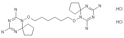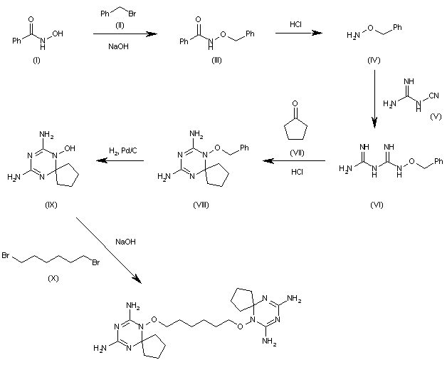 The reaction of benzohydroxamic acid (I) with benzyl bromide (II) by means of NaOH on ethanol gives the corresponding benzyl ester (III), which is treated with HCl yielding O-benzylhydroxylamine (IV). The reaction of (IV) with dicyaniamide (V) in ethanol affords the biguanide (VI), which is cyclized with cyclopentanone (VII) and HCl giving 1-benzyloxy-2,2-dimethyl-1,2-dihydro-1,3,5-triazine-4,6-diamine (VIII). The debenzylation of (VIII) with H2 over PtO2 in ethanol yields 1-hydroxy-2,2-dimethyl-1,2-dihydro-1,3,5-triazine-4,6-diamine (IX), which is finally condensed with 1,6-dibromohexane (X) by means of NaOH in methanol.
