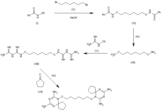 The reaction of benzohydroxamic acid (I) with 1,6-dibromohexane (X) by means of NaOH in methanol gives the bis benzohydroxamic ester (XI), which is treated with HCl to afford the subituted bis hydroxylamine (XII). The reaction of (XII) with dicyandiamide (V) in ethanol yields the bis biguanide (XIII), which is finally cyclized with cyclopentanone (VII) and HCl as before.
