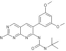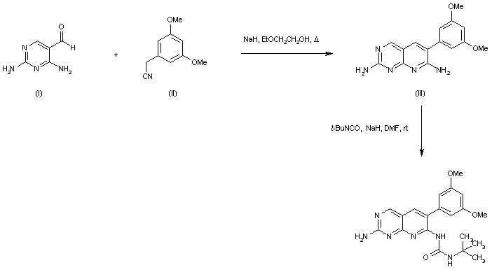 Condensation of pyrimidine carboxaldehyde (I) with 3,5-dimethoxy-phenylacetonitrile (II) using NaH in 2-ethoxyethanol provided the pyridopyrimidine (III). Then, regioselective condensation of (III) with tert-butyl isocyanate at the 7-amino group in the presence of NaH in DMF furnished the corresponding urea.