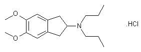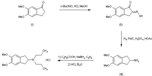 Nitrosation of 5,6-dimethoxy-1-indanone (I) with n-butyl nitrite and HCl in MeOH at 40 C provided oxime (II). Subsequent catalytic hydrogenation of ketone and oxime groups of (II) afforded the 2-aminoindan (III). Reductive alkylation of (III) using propionic acid and NaBH4 then gave the target dipropylamino compound, which was isolated as the hydrochloride salt after separation of some unreacted material by treatment with phenyl isocyanate.