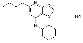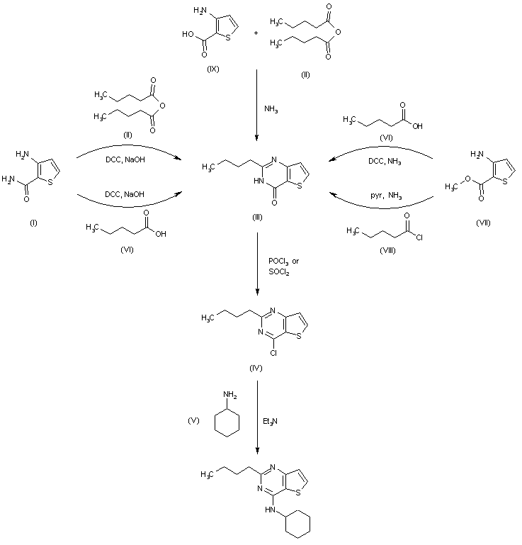 This compound can be obtained by several related ways: 1.- The cyclization of 3-aminothiophene-2-carboxamide (I) with pentanoyl anhydride (II) by means of DCC, DMAP and pyridine in DMF and NaOH gives 2-butylthieno[3,2-d]pyrimidin-4(3H)-one (III), which by reaction with POCl3 or SOCl2 affords 2-butyl-4-chlorothieno[3,2-d]pyrimidine (IV). Finally, this compound is condensed with cyclohexylamine (V) by means of triethylamine in in THF. 2.- The intermediate 2-butylthieno[3,2-d]pyrimidin-4-(3H)-one (III) can be obtained by other ways: a.- By cyclization of amide (I) with pentanoic acid (VI) by means of DCC, DMAP and pyridine in DMF and NaOH. b.- By cyclization of 3-aminothiophene-2-carboxylic acid methyl ester (VII) with pentanoic acid (VI) by means of DCC, DMAP and ammonia in dichloromethane. c.- By cyclization of 3-aminothiophene-2-carboxylic acid methyl ester (VII) with pentanoyl chloride (VIII) by means of pyridine and ammonia. d.- By cyclization of 3-aminothiophene-2-carboxylic acid (IX) with pentanoic anhydride (II) and ammonia.
