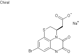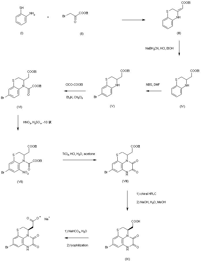 | 合成路线图解说明: Benzothiazin (III) was prepared by condensation of 2-aminothiophenol (I) with ethyl 4-bromoacetoacetate (II). Subsequent reduction of (III) with NaBH3CN provided (IV), which was brominated using N-bromosuccinimide to afford (V). This was coupled with ethyl oxalyl chloride to give amide (VI). Nitration of (VI) was then performed with HNO3 in H2SO4 at -10 C. Further reduction of the nitro group of (VII) with concomitant cyclization produced the tricyclic compound (VIII). After resolution by chiral preparative HPLC, the required (R)-enantiomer was hydrolyzed with NaOH to afford carboxylic acid (IX). This compound was finally isolated as the sodium salt upon treatment with aqueous NaHCO3, followed by lyophilization. |