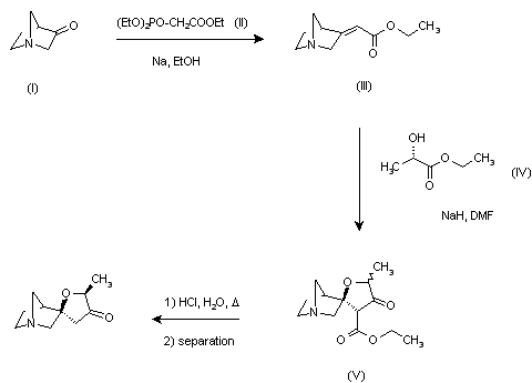 | 合成路线图解说明: The Horner-Emmons reaction of 1-azabicyclo[2.2.1]heptan-3-one (I) with triethyl phosphonoacetate (II) gave conjugated ester (III). Subsequent Michael addition of the oxyanion of ethyl (S)-lactate (IV), generated in the presence of NaH in DMF, with concomitant Dieckmann cyclization, produced ketoester (V). Then, hydrolysis and decarboxylation in boiling 1 N HCl, followed by separation of the syn and anti isomers, yielded the title compound. |
