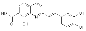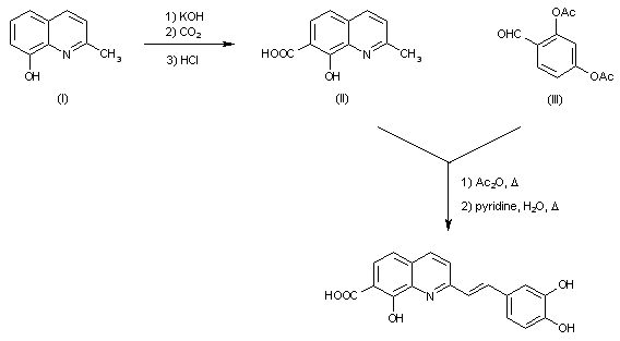 8-Hydroxyquinaldine (I) reacts with KOH in refluxing toluene. Treatment with CO2 and acidification with HCl then affords carboxylic acid (II). Condensation of 8-hydroxy-7-quinaldic acid (II) with 3,4-diacetoxybenzaldehyde (III) in refluxing acetic anhydride (Ac2O) followed by treatment with a refluxing mixture of pyridine/H2O affords the desired product.