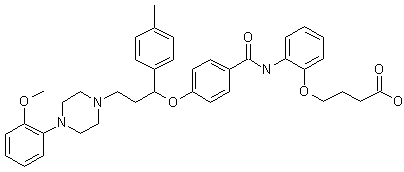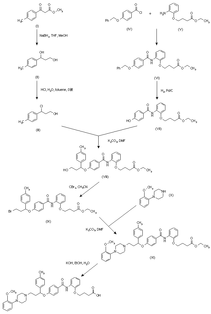 Reduction of ketoester (I) with NaBH4 in THF-MeOH afforded diol (II), which was treated with HCl in toluene to give chlorohydrin (III). Benzanilide (VII) was prepared by condensation of acid chloride (IV) with aniline (V), followed by catalytic hydrogenolysis of the resulting benzyl ether (VI). Then, alkylation of phenol (VII) with chloride (III) in the presence of K2CO3 provided ether (VIII). The hydroxyl group of (VIII) was converted to bromide (IX) using CBr4 and this compound was condensed with N-(2-methoxyphenyl)piperazine (X) to produce disubstituted piperazine (XI). The ethyl ester group of (XI) was finally hydrolyzed using KOH in aqueous EtOH.