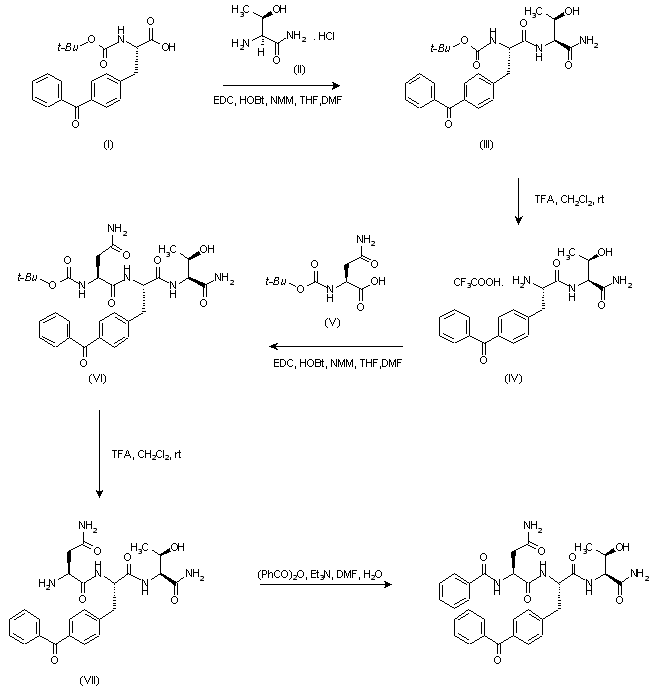 Coupling of N-Boc-benzoylphenylalanine (I) with threoninamide (II) using 1-(dimethylaminopropyl)-3-ethylcarbodiimide-HCl (EDC) and 1-hydroxybenzotriazole (HOBt) in the presence of N-methylmorpholine (NMM) afforded the N-Boc-dipeptide (III), which was deprotected with trifluoroacetic acid in CH2Cl2 to give (IV). Further coupling of (IV) with N-Boc-asparagine (V) using EDC and HOBt, followed by Boc deprotection with trifluoroacetic acid, provided tripeptide (VII). Finally, acylation of (VII) with benzoic anhydride in the presence of triethylamine furnished the target benzamide.