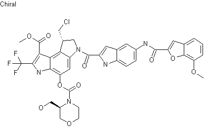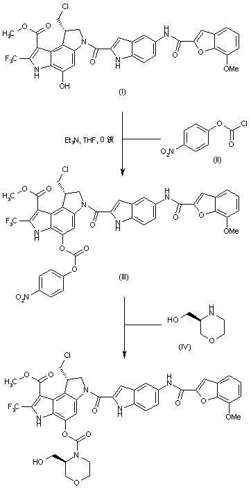 The known phenolic antibiotic (I) was treated with p-nitrophenyl chloroformate (II) in the presence of Et3N to give carbonate (III). Then, condensation of (III) with (R)-3-(hydroxymethyl)morpholine (IV) furnished the target carbamate.