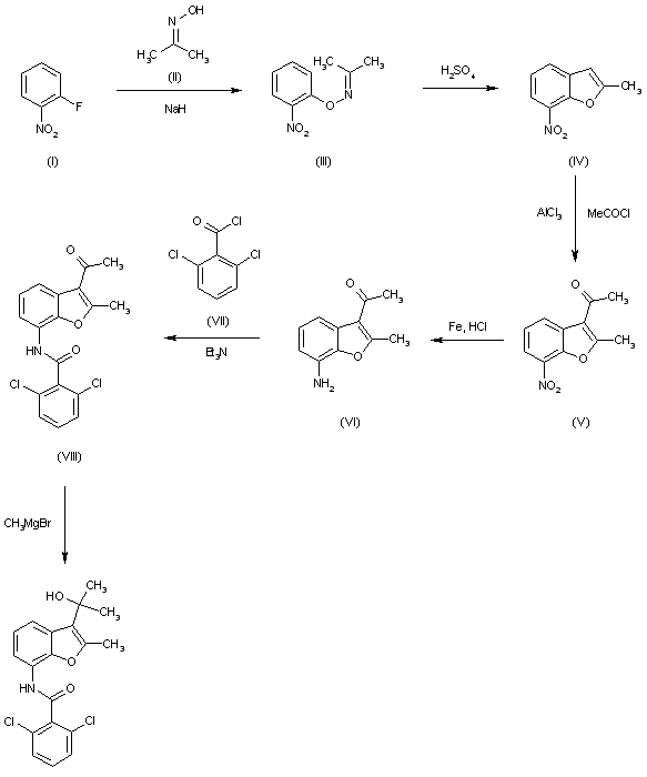The condensation of 2-fluoronitrobenzene (I) with acetone oxime (II) by means of NaH in DMF gives acetone O-(2-nitrophenyl)oxime (III), which is cyclized to 2-methyl-7-nitrobenzofuran (IV) by means of H2SO4. The Friedel Crafts acylation of (IV) with acetyl chloride and AlCl3 in dichloromethane affords 3-acetyl-2-methyl-7-nitrobenzofuran (V), which is reduced to the corresponding amino derivative (VI) with Fe and HCl in ethanol. The condensation of (VI) with 2,6-dichlorobenzoyl chloride (VII) by means of triethylamine in dichloroethane yields N-(3-acetyl-2-methylbenzofuran-7-yl)-2,6-dichlorobenzamide (VIII), which is finally submitted to a Grignard reaction with methylmagnesium bromide in THF.