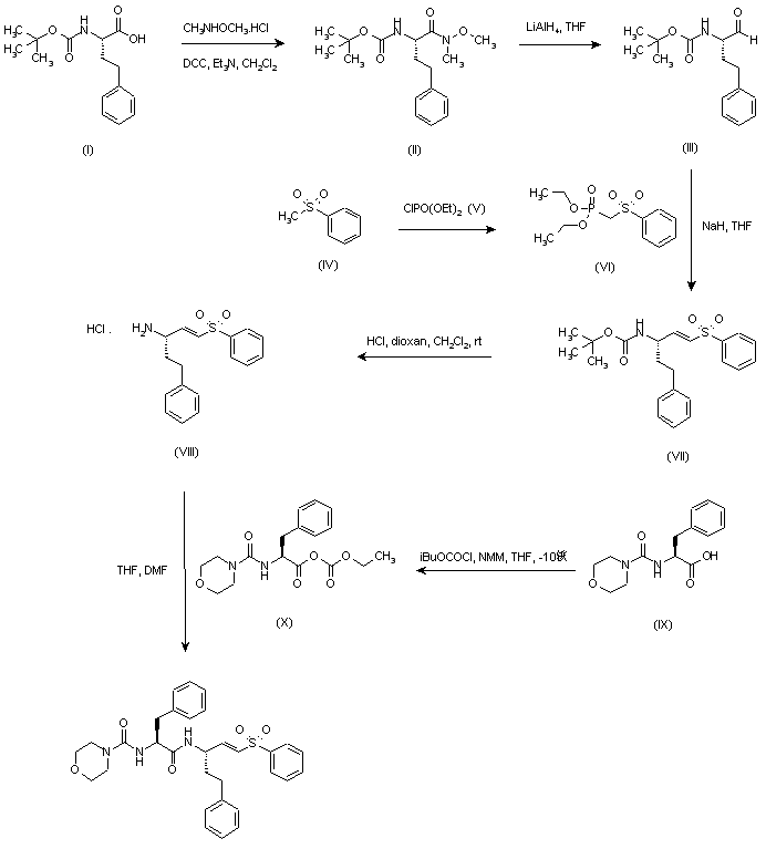 | 合成路线图解说明: N-Boc-Homophenylalanine (I) was coupled to N,O-dimethyl hydroxylamine using DCC, and the resulting N-methoxy amide (II) was reduced to aldehyde (III) with LiAlH4. Sulfonyl phosphonate (VI), (prepared from methyl phenyl sulfone (IV) and diethyl chlorophosphate (V)), was then condensed with aldehyde (III) in the presence of NaH to provide the vinylogous sulfone (VII). Subsequent acid deprotection of the Boc group of (VII) yielded amine (VIII). This was finally coupled with mixed anhydride (X), (obtained from morpholinocarbonyl-phenylalanine (IX) and isobutyl chloroformate in the presence of N-methylmorpholine), to furnish the target amide. |