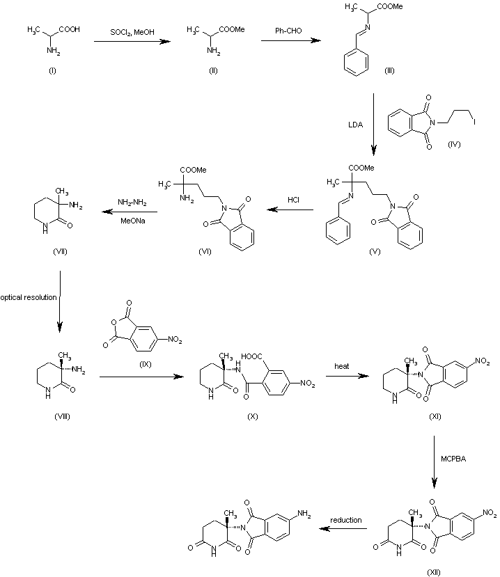 The esterification of 2-aminopropionic acid (I) with SOCl2 and methanol gives the methyl ester (II), whih is treated with benzaldehyde and TEA in dichloromethane yielding the benzylideneimine (III). The alkylation of (III) with N-(3-iodopropyl)phthalimide (IV) by means of LDA in THF affords the substituted pentanoate (V), which is treated with 1N HCl to give 2-amino-2-methyl-5-(phthalimido)pentanoic acid methyl ester (VI). The cyclization of (VI) by means of hydrazine and sodium methoxide in methanol yields the racemic 3-amino-3-methylpiperidin-2-one (VII), which is submitted to optical resolution with optically active binaphthyl phosphoric acid to afford 3(S)-amino-3-methylpiperidin-2-one (VIII). The reaction of (VIII) with 4-nitrophthalic anhydride (IX) in dioxane gives the amide (X), which is heated under vacuum to give the phthalimide (XI). The oxidation of (XI) with mCPBA in carbon tetrachloride yields the piperidinedione (XII), which is finally reduced at the nitro group by the usual methods.