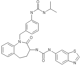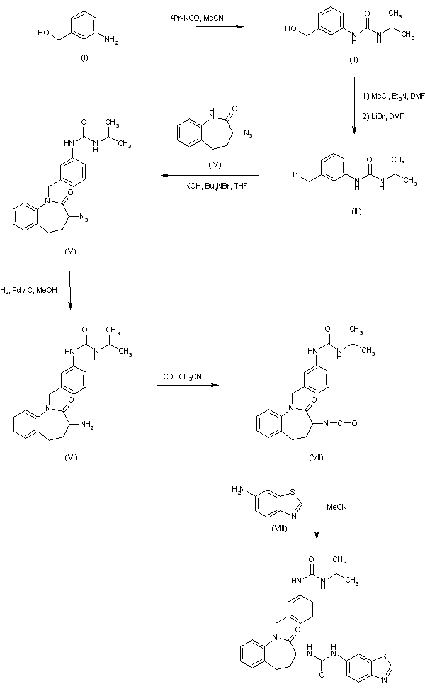 Treatment of 3-aminobenzyl alcohol (I) with isopropyl isocyanate produced urea (II). Mesylation of alcohol (III), followed by reaction with LiBr gave benzyl bromide (III). Then, alkylation of 3-azidobenzazepine (IV) with (III) under phase-transfer conditions afforded (V). The azido group of (V) was reduced to amine (VI) by catalytic hydrogenation over Pd/C. Subsequent treatment of (VI) with carbonyl diimidazole produced isocyanate (VII). This was finally converted to the target compound by condensation with 6-aminobenzothiazole (VIII).