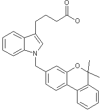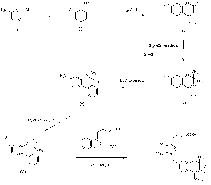 Cyclization of m-cresol (I) with ethyl 2-oxocyclohexanecarboxylate (II) in H2SO4 afforded tricyclic benzopyranone (III). This was treated with MeMgBr in boiling anisole to provide the tricyclic dimethylbenzopyran (IV). Dehydrogenation of (IV) using 2,3-dichloro-5,6-dicyano-1,4-benzoquinone gave dibenzopyran (V), which by further bromination with N-bromosuccinimide and 2,2'-azobis(4-methoxy-2,4-dimethylvaleronitrile) produced bromide (VI). Finally, N-alkylation of 4-(3-indolyl)butyric acid (VII) with bromide (VI) in the presence of two equivalents of NaH yielded the title compound.