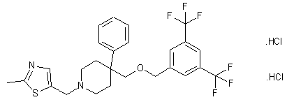 This compound can be obtained by two related ways: 1.- The reduction of 4-phenylpiperidine-4-carboxylic acid (I) with LiAlH4 in THF gives the corresponding methanol derivative (II), which is treated with tert-butoxycarbonyl anhydride in THF to yield the N-protected piperidine (III). The acylation of (III) with 3,5-bis(trifluoromethyl)benzyl bromide (IV) by means of NaH in DMF affords the corresponding ether (V), which is deprotected with HCl in ethyl ether to afford the free piperidine (VI) (1,2). Finally, (VI) is reductocondensed with 2-methylthiazole-5-carbaldehyde (VII) by means of sodium cyanoborohydride in methanol/acetic acid. 2.- The piperidine derivative (VI) can also be condensed with 5-(bromomethyl)-2-methylthiazole (VIII) by means of K2CO3 in DMF.