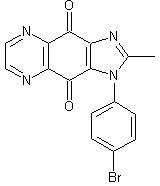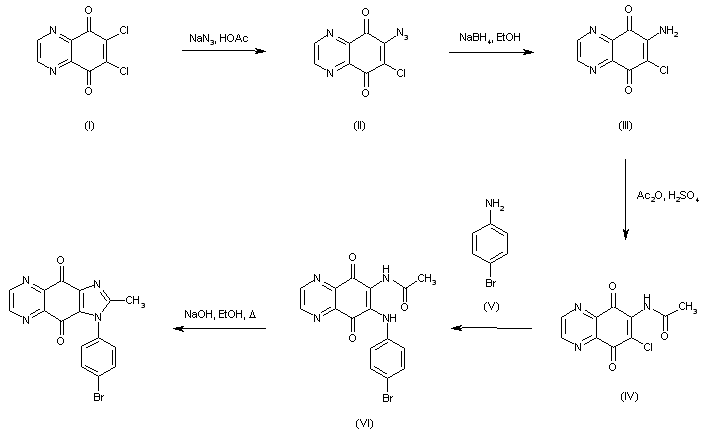 Treatment of 6,7-dichloro-5,8-quinoxalinedione (I) with sodium azide in AcOH afforded azide (II), which was reduced to amine (III) using NaBH4. Acetylation of (III) with Ac2O and a catalytic amount of H2SO4 yielded amide (IV). Subsequent reaction of (IV) with 4-bromoaniline (V) produced the corresponding (4-bromophenyl)aminoquinoxaline (VI). Finally, conversion of (VI) into the target imidazole was performed by treatment with NaOH in refluxing EtOH.
