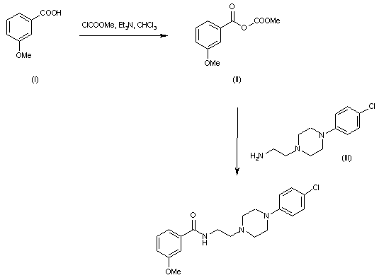 The condensation of 1-(4-chlorophenyl)piperazine (I) with 2-chloroacetonitrile (II) gives 2-[4-(4-chlorophenyl)-1-piperazinyl]acetonitrile (III), which is reduced with borane/dimethylsulfide yielding the corresponding primary amine (IV). Finally, (IV) is condensed with 3-methoxybenzoyl chloride.
