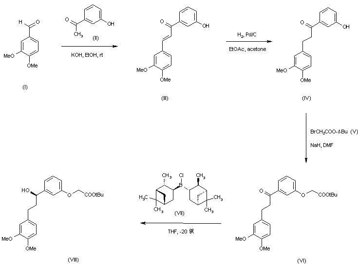 The intermediate alcohol (VIII) was prepared as shown in Scheme 27060901a: Aldol condensation of 3,4-dimethoxybenzaldehyde (I) with 3-hydroxyacetophenone (II) in the presence of KOH provided chalcone (III), which was hydrogenated over Pd/C to yield the corresponding diarylpropanone (IV). Subsequent alkylation of the phenolic hydroxyl group of (IV) with tert-butyl bromoacetate (V) using NaH in DMF gave ether (VI). Then, enantioselective reduction of ketone by means of (+)-beta-chlorodiisopinocampheylborane (VII) at -20 C furnished the (R)-alcohol (VIII).
