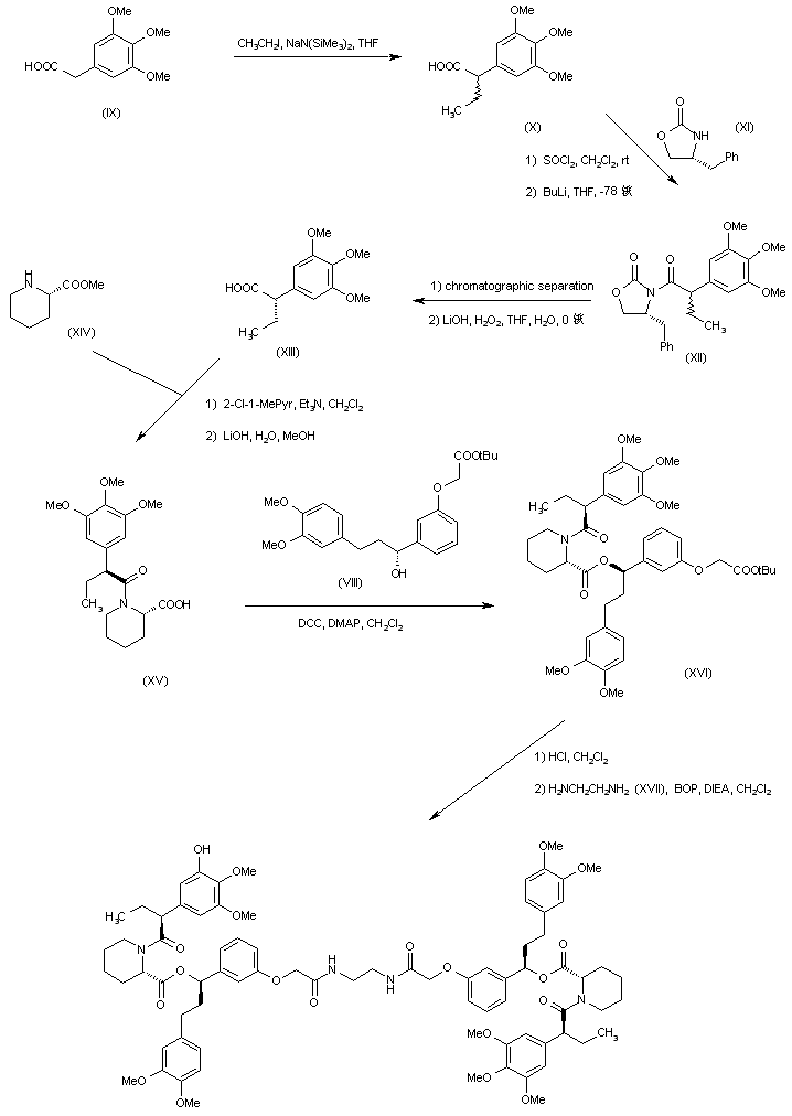 In an alternative procedure, the intermediate alcohol (VIII) was coupled with N-Fmoc-(S)-pipecolic acid (XVIII) using DCC and DMAP to give ester (XIX). Subsequent deprotection of the Fmoc group of (XIX) by means of pyrrolidine provided amine (XX). This was further coupled to racemic 2-(3,4,5-trimethoxyphenyl)butyric acid (X), and the resulting diastereomeric mixture of amides (XXI) was separated by column chromatography. Then, TFA-promoted cleavage of the tert-butyl ester from the desired (S,S)-diastereoisomer provided carboxylic acid (XXII), which was finally coupled to ethylenediamine in the same way as before.