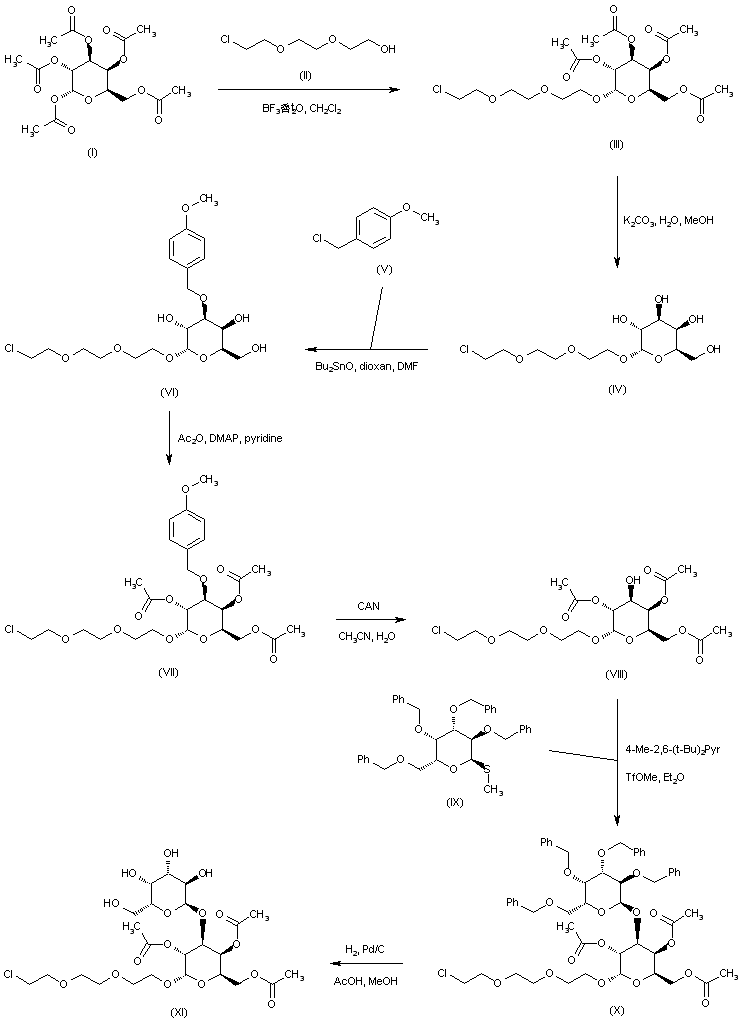 Condensation of galactose pentaacetate (I) with 2-[2-(2-chloroethoxy)ethoxy]ethanol (II) in the presence of boron trifluoride etherate afforded the galactopyranoside (III). Subsequent hydrolysis of the acetate esters of (III) to give (IV) was carried out employing K2CO3 in MeOH. The galactose 3-hydroxyl group of (IV) was selectively protected as the p-methoxybenzyl ether (VI) by treatment with p-methoxybenzyl chloride (V) in the presence of dibutyltin oxide. After acetylation of the remaining free hydroxyl groups of (VII) to give (VIII), oxidative cleavage of its p-methoxybenzyl ether by means of cerium ammonium nitrate afforded the 2,4,6-triacetylated pyranoside (VIII). This was condensed with the galactose thioglycoside (IX) in the presence of methyl triflate to furnish the protected disaccharide (X). The benzyl protecting groups of (X) were then removed by hydrogenolysis yielding (XI).