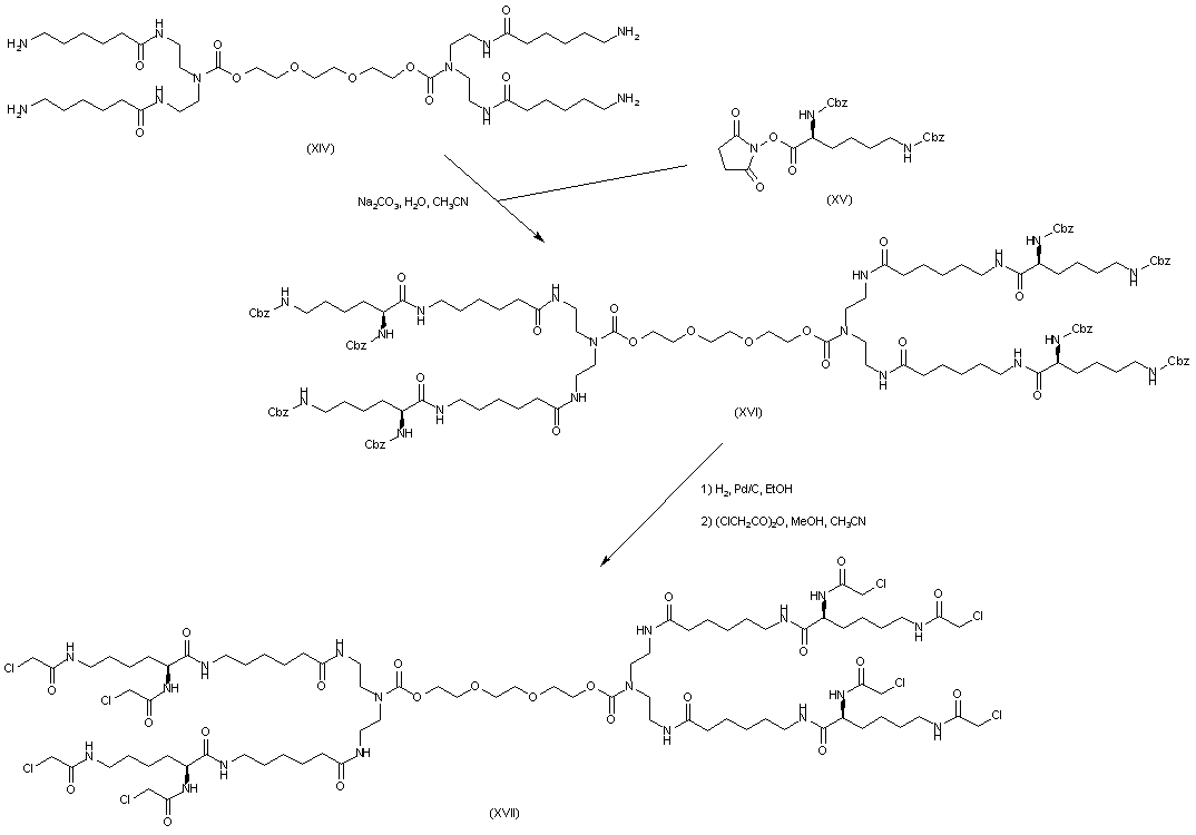 Coupling of the tetraamino compound (XIV) with bis(carbobenzoxy)lysine hydroxysuccinimidyl ester (XV) yielded the corresponding tetraamide (XVI). The carbobenzoxy groups of (XVI) were removed by catalytic hydrogenation over Pd/C, and the deprotected polyamino compound was then acylated with chloroacetic anhydride to afford the octa(chloroacetamide) (XVII).