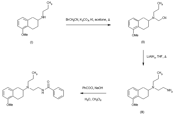 Alkylation of aminotetralin (I) with bromoacetonitrile in boiling acetone gave cyanomethyl compound (II). This was subsequently reduced to diamine (III) using LiAlH4. Condensation of (III) with benzoyl chloride under Schotten-Baumann conditions then yielded the corresponding benzamide.