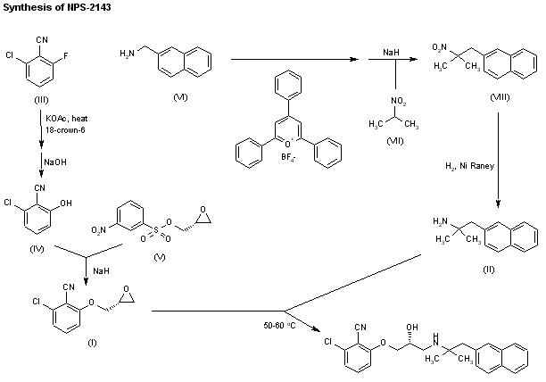 NPS-2143 can be obtained by coupling 2-chloro-6-[2(R)-oxiranylmethoxy]benzonitrile (I) with 1,1-dimethyl-2-(2-naphthyl)ethylamine (II) in ethanol at 50-60 C. Intermediates (I) and (II) can be obtained as follows: a) Treatment of 2-chloro-6-fluorobenzonitrile (III) with 18-crown-6 and potassium acetate in refluxing acetonitrile, followed by hydrolysis with NaOH in H2O provides 3-chloro-2-cyanophenol (IV), which is then condensed with 3-nitrobenzenesulfonic acid (2R)-2-oxiranylmethyl ester (V) in DMF by means of NaH to furnish 2-chloro-6-[2(R)-oxiranylmethoxy]benzonitrile (I). b) Treatment of 2-(aminomethyl)naphthalene (VI) with 2,4,6-triphenylpyrylium tetrafluoroborate in EtOH, followed by the reaction of the resulting compound dissolved in DMSO with the sodium salt obtained by treatment of 2-nitropropane (VII) with NaH in MeOH, gives the nitro derivative (VIII). Finally, reduction of the nitro group of (VIII) by hydrogenation over Ni Raney in EtOH yields 1,1,-dimethyl-2-(2-naphthyl)ethylamine (II).