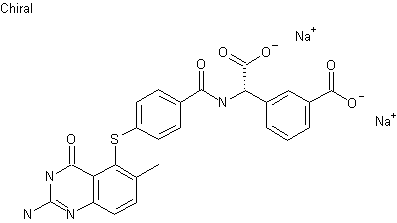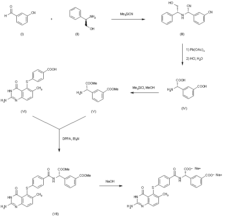 Strecker condensation of 3-cyanobenzaldehyde (I) with trimethylsilyl cyanide in the presence of (S)-2-phenylglycine (II) yielded the chiral aminonitrile (III) as the major diastereoisomer. Oxidative cleavage of the chiral auxiliary of (III) with lead tetraacetate, followed by acid hydrolysis of the nitrile groups provided the (S)-amino acid (IV), which was esterified with MeOH and Me3SiCl. The resulting aminoester (V) was coupled with carboxylic acid (VI) using diphenylphosphoryl azide to form amide ester (VII). Finally, saponification of both methyl esters of (VII) afforded the target dicarboxylate salt.