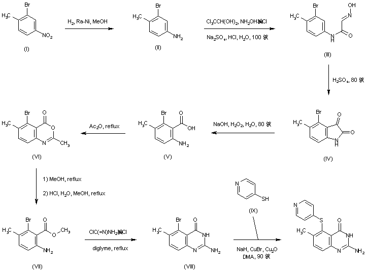 Catalytic hydrogenation of 2-bromo-4-nitrotoluene (I) over Raney-Ni provided aniline (II). Reaction of (II) with chloral hydrate and hydroxylamine gave rise to the isonitrosoacetanilide (III), which was subsequently cyclized to the isatin (IV) by heating in concentrated H2SO4. Oxidative cleavage of isatin (IV) produced the anthranilic acid (V). This was converted to the benzoxazinone (VI) upon refluxing with acetic anhydride. Ring opening of benzoxazinone (VI) with MeOH, followed by acidic hydrolysis of the acetamide function, yielded the anthranilate ester (VII). The quinazoline derivative (VIII) was then obtained by treatment of anthranilate (VII) with chloroformamidine hydrochloride in refluxing diglyme. Finally, displacement of the bromide group of (VIII) with the sodium thiolate of 4-mercaptopyridine (IX) under Ullmann conditions afforded the title pyridyl sulfide.