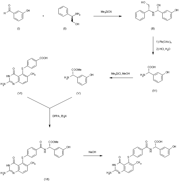 Strecker condensation of 3-hydroxybenzaldehyde (I) with trimethylsilyl cyanide in the presence of (S)-2-phenylglycine (II) yielded the chiral aminonitrile (III) as the major diastereoisomer. Oxidative cleavage of the chiral auxiliary of (III) with lead tetraacetate, followed by acid hydrolysis of the nitrile group provided the (S)-amino acid (IV), which was esterified with MeOH and Me3SiCl. The resulting aminoester (V) was coupled with carboxylic acid (VI) using diphenylphosphoryl azide to form amide ester (VII). Finally, saponification of the methyl ester of (VIII) afforded the target carboxylic acid.