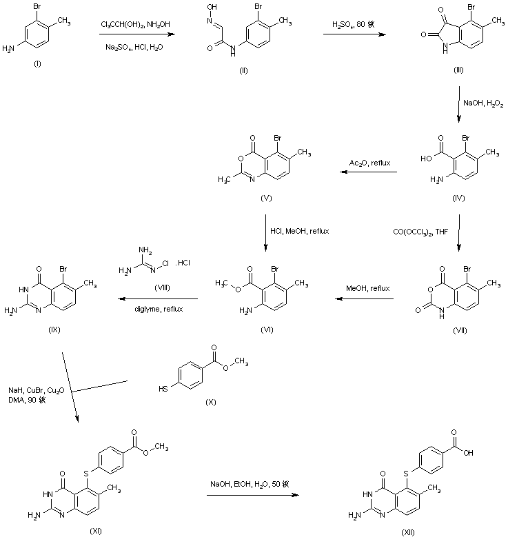 3-Bromo-4-methylaniline (I) was converted to the isonitrosoacetanilide (II) upon treatment with chloral hydrate and hydroxylamine. Cyclization of (II) in hot sulfuric acid produced the isatin (III) along with its 6-bromo regioisomer. Anthranilic acid (IV) was then obtained by oxidative cleavage of isatin (III). Esterification of anthranilic acid (IV) was achieved by conversion to the benzoxazinone (V) with acetic anhydride, followed by conversion to methyl anthranilate (VI) in boiling methanol. Alternatively, anthranilic acid (IV) was activated as the isatoic anhydride (VII) with triphosgene and then reacted with MeOH. Anthranilate (VI) was converted to the aminoquinazolinone (IX) upon condensation with chloroformamidine hydrochloride (VIII) at elevated temperature. Coupling of bromide (IX) with methyl 4-mercaptobenzoate (X) under Ullmann reaction conditions furnished thioether (XI). The methyl ester group was then hydrolyzed to the acid (XII) with NaOH in aqueous EtOH.