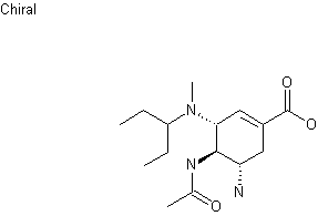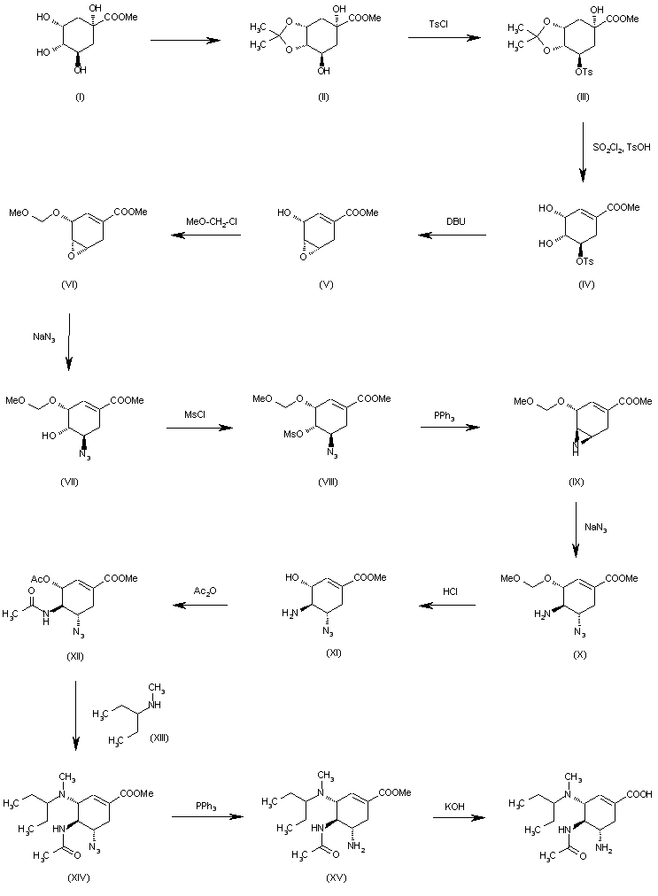 (-)-Quinic acid (I) is converted into the acetonide (II) in the usual way and its secondary alcohol is converted into the tosylate (III) by reaction with tosyl chloride and DMAP in pyridine. The dehydration of (III) with SOCl2 and pyridine in methanol yields the cyclohexenecarboxylate (IV), which is epoxidized by means of DBU inb THF affording the epoxide (V). The protection of the free hydroxy group of (V) with methoxymethyl chloride and DIPEA in dichloromethane gives the ether (VI), which is treated with sodium azide in methanol yielding the azido alcohol (VII). The reaction of (VII) with methanesulfonyl chloride and triethylamine in dichloromethane affords the mesylate (VIII), which is submitted to a reductocyclization with triphenylphosphine in in THF providing the aziridine (IX). The cleavage of the aziridine group of (IX) with sodium azide in DMF gives the amino azide (X), which is deprotected at the methoxymethyl ether by a treatment with HCl in methanol to afford the alcohol (XI). The acetylation of (XI) with acetic anhydride in pyridine gives the N,O-diacetyl derivative (XII), which is condensed with N-(1-ethylpropyl)-N-methylamine (XIII) by means of palladium tetrakis(triphenylphosphine) in THF yielding the tertiary amine (XIV). The azido group of (XIV) in then reduced with triphenylphosphine in THF/water providing the amino intermediate (XV), which is finally hydrolyzed with KOH in aqueous THF.