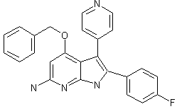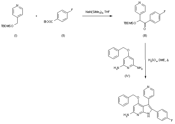 Sylilated hydroxymethylpyridine (I) was condensed with ethyl 4-fluorobenzoate (II) in the presence of sodium hemamethyldisilazide to produce the silyloxy ketone (III). Subsequent reaction of (III) with diaminopyrimidine (IV) in the presence of H2SO4 in refluxing dimethoxyethane yielded the title pyrrolopyridine.