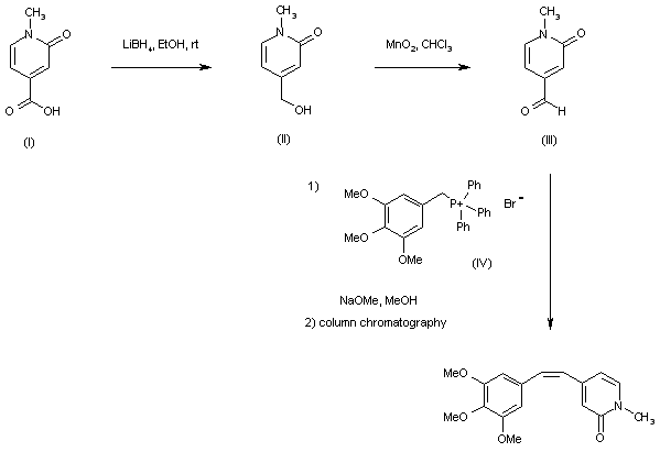 Reduction of N-methyl-2-pyridone-4-carboxylic acid (I) with LiBH4 provided alcohol (II), which was further oxidized to aldehyde (III) with MnO2. Wittig reaction of (III) with trimethoxybenzylphosphonium salt (IV) in the presence of NaOMe provided a mixture of E and Z olefins, from which the target Z isomer was isolated by column chromatography.