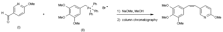 Title compound was prepared by Wittig reaction of 2-methoxypyridine-5-carboxaldehyde (I) with trimethoxybenzylphosphonium salt (II) in the presence of NaOMe, followed by chromatographic separation of the mixture of E and Z isomers.