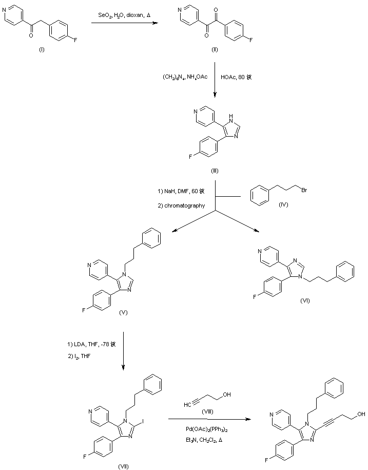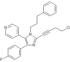 Selenium dioxide oxidation of diaryl ethanone (I) afforded diketone (II), which was cyclized to the imidazole (III) by reaction with hexamethylenetetramine and ammonium acetate in hot AcOH. Alkylation of (III) with 1-bromo-3-phenylpropane (IV) in the presence of NaH gave rise to a mixture of regioisomeric imidazoles (V) and (VI) that were separated by column chromatography. After deprotonation of the desired isomer (V) with LDA, treatment with iodine produced iodoimidazole (VII). Then, palladium-catalyzed coupling of (VII) with 3-butyn-1-ol (VIII) yielded the title compound.