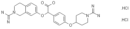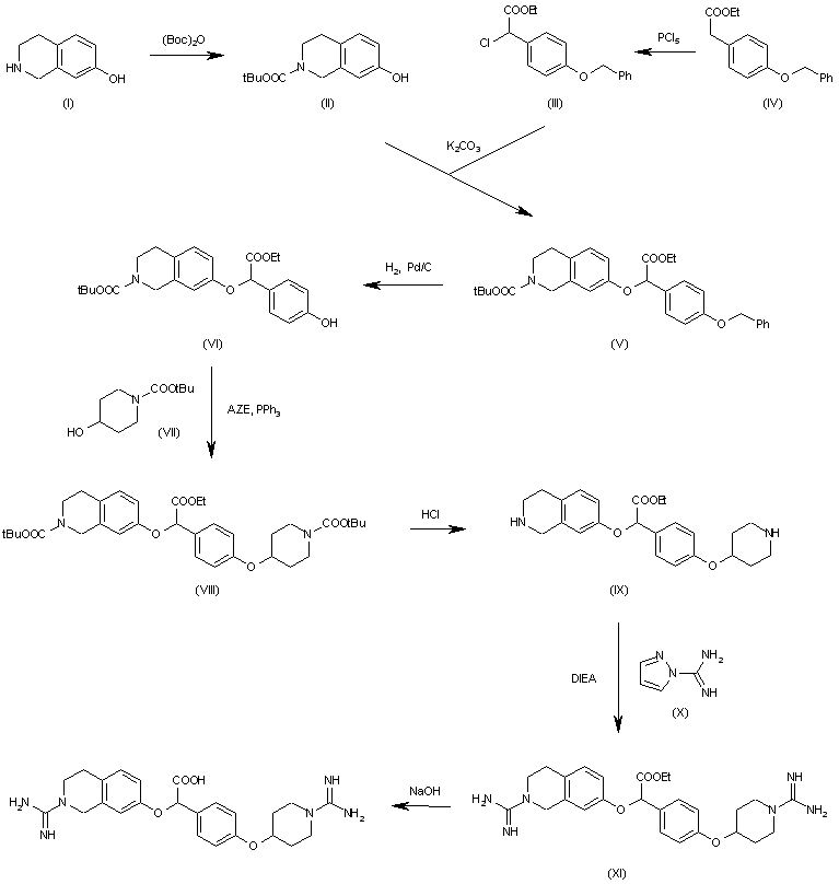 | 合成路线图解说明: The reaction of 7-hydroxy-1,2,3,4-tetrahydroisoquinoline (I) with di-tert-butyl dicarbonate and triethylamine in dichloromethane gives 7-hydroxy-1,2,3,4-tetrahydroisoquinoline-2-carboxylic acid tert-butyl ester (II), which is condensed with 2-(4-benzyloxyphenyl)-2-chloroacetic acid ethyl ester (III) (obtained by chlorination of 2-(4-benzyloxyphenyl)acetic acid ethyl ester (IV) with PCl5), by means of K2CO3 in refluxing acetonitrile yields the disubstituted acetate (V). The selective debenzylation of (V) with H2 over Pd/C in ethyl acetate affords the phenol (VI), which is alkylated with 4-hydroxypiperidine-1-carboxylic acid tert-butyl ester (VII) by means of diethyl azodicarboxylate (AZE) and triphenyl phosphine providing the protected intermediate (VIII). The deprotection of (VIII) with HCl in ethanol gives intermediate (IX) with two free NH groups, which is treated with pyrazole-1-carboxamidine (X) and diisopropylethylamine (DIEA) in DMF yielding the bis amidino derivative (XI), which is finally hydrolyzed with NaOH in ethanol/water. |