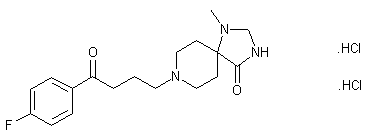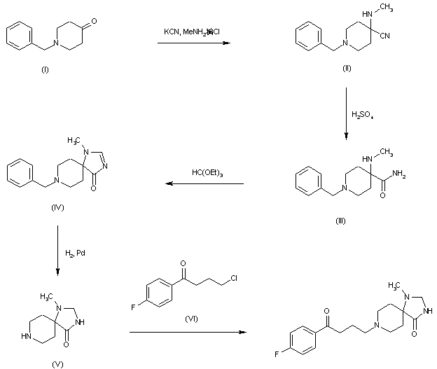 The title compound is prepared by two related methods. N-Benzyl-4-piperidone (I) is condensed with KCN and MeNH2.HCl to produce amino nitrile (II). Partial hydrolysis of nitrile (II) with H2SO4 furnishes amide (III). Condensation of the amino amide (III) with triethyl orthoformate gives rise to the spiro imidazolinone (IV). Catalytic hydrogenation of the imidazoline double bond of (IV) and simultaneous N-benzyl group hydrogenolysis gives rise to 1-methyl-1,3,8-triazaspiro[4,5]decan-4-one (V). This is finally alkylated with 4'-fluoro-4-chlorobutyrophenone (VI) to yield the desired compound (1,2).