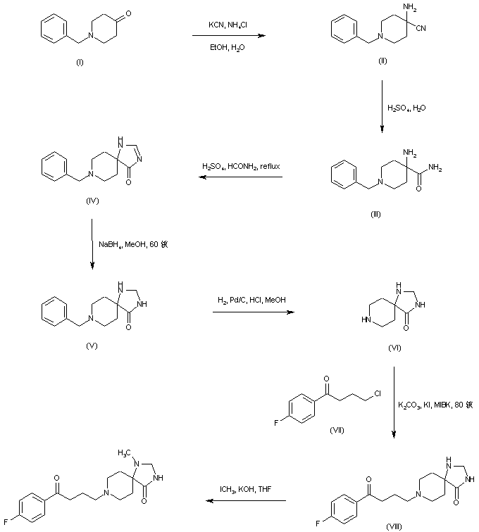 Similarly, the condensation of N-benzyl-4-piperidone (I) with KCN in the presence of NH4Cl provides amino nitrile (II), which is further hydrolyzed to amide (III) with 95% H2SO4. Cyclization of amino amide (III) with formamide under acidic conditions yields the spiro imidazolinone (IV), which is further reduced to imidazolidinone (V) employing NaBH4 in hot MeOH. Debenzylation of (V) with H2 and Pd/C provides 1,3,8-triazaspiro[4,5]decan-4-one (VI). Then, alkylation of (VI) with 4'-fluoro-4-chlorobutyrophenone (VII) by means of K2CO3 and catalytic KI in methyl isobutyl ketone furnishes (VIII). The imidazolidinone ring of (VIII) is finally methylated with iodomethane and KOH to produce the title compound (2).