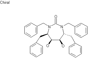 Swern oxidation of N-(benzyloxycarbonyl)-(R)-phenylalaninol (I) with DMSO and oxalyl chloride afforded the corresponding aldehyde (II). Subsequent pinacol dimerization by treatment with VCl3 and Zn gave diol (III) with a 98% diastereomeric purity. After protection of the hydroxyl groups of (III) as the [2-(trimethylsilyl) ethoxy]methyl (SEM) ethers upon treatment with SEMCl and diisopropyl ethylamine, (IV) was obtained, then the N-benzyloxycarbonyl groups were removed by hydrogenolysis in the presence of Pd/C. The resulting diamine (V) was cyclized with carbonyl diimidazole and pyridine to furnish the cyclic urea (VI). Alkylation with benzyl bromide (VII) and NaH provided the bisbenzylated compound, which was subsequently deprotected by treatment with HCl in MeOH-dioxan to give (VIII) (1). The stereoselective hydroxyl inversion of the diol was then achieved Swern by oxidation to the ketol (IX), followed by reduction with NaBH4 in EtOH, and purification of the major isomer by column chromatography.