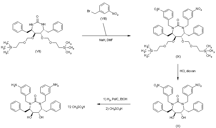 Alkylation of diazepinone (VII) with m-nitrobenzyl bromide (VIII) in the presence of NaH gave the bis-nitrobenzyl derivative (IX). The silylethoxymethyl protecting groups of (IX) were then removed by means of HCl in dioxan to afford diol (X). The nitro groups of (X) were finally reduced by catalytic hydrogenation to the target diamino compound, which was finally converted to the bis-methanesulfonate salt.