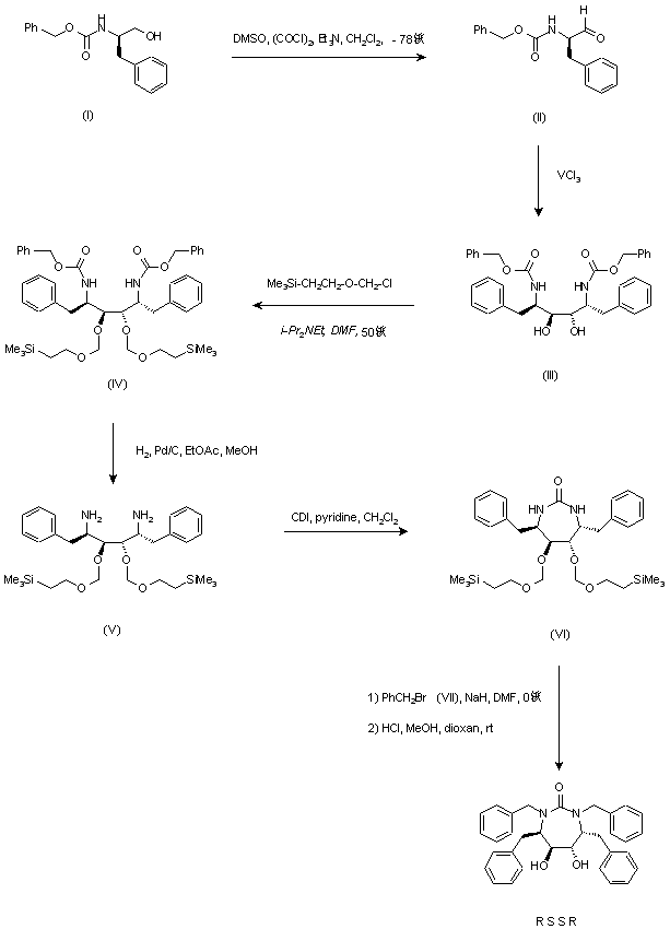 Swern oxidation of N-(benzyloxycarbonyl)-(R)-phenylalaninol (I) with DMSO and oxalyl chloride afforded the corresponding aldehyde (II). Subsequent pinacol dimerization by treatment with VCl3 and Zn gave diol (III) with a 98% diastereomeric purity. After protection of the hydroxyl groups of (III) as the [2-(trimethylsilyl) ethoxy]methyl (SEM) ethers upon treatment with SEMCl and diisopropyl ethylamine, (IV) was obtained, then the N-benzyloxycarbonyl groups were removed by hydrogenolysis in the presence of Pd/C. The resulting diamine (V) was cyclized with carbonyl diimidazole and pyridine to furnish the cyclic urea (VI). Alkylation with benzyl bromide (VII) and NaH provided the bisbenzylated compound, which was finally deprotected by treatment with HCl in MeOH-dioxan.